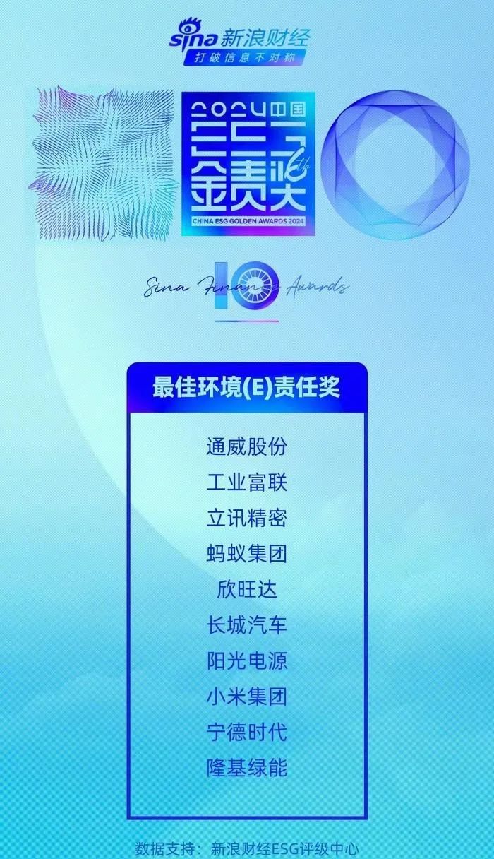 1月16日,由新浪財經主辦的2024企業(yè)ESG“金責獎”評選結果正式公布。經ESG權威評級數據庫評分、公眾投票及專家評審委員會嚴格審核,立訊精密榮獲2024企業(yè)ESG“金責獎”——最佳環(huán)境(E)責任獎。